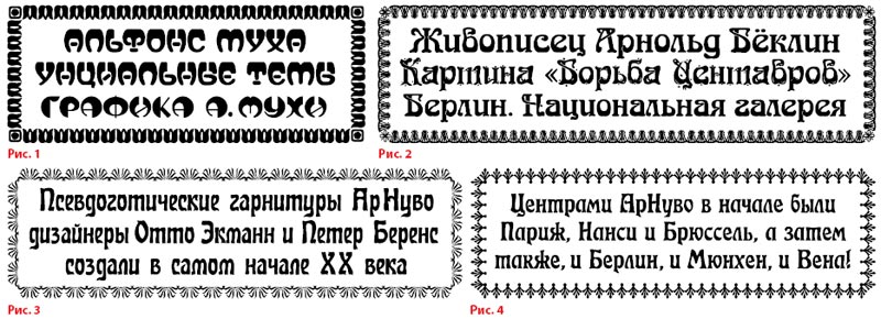 Согласно генезису развития европейского письма, в следующем примере представлены стилизации, связанные с минускулом (рис. 2). Шрифты, использованные в данном примере, основаны на графике описывавшегося в первой части статьи шрифта Arnold Boecklin (дизайнер Отто Вайзерт, 1904 год), который является характерным образцом растительной трактовки стилистики ар нуво. Отметим, что здесь использован оригинальный графический материал, а не приснопамятный шрифт Skazka. С методической точки зрения важно указать на то, что прописные буквы латинского прообраза имеют сходство с рисунком ломбардских версалов. В свою очередь, в графике строчных букв просматривается стилизационная связь с рукописным прямостоящим курсивным минускулом. Нужно также отметить, что шрифт средней строки близок по строю к шрифту, которым набраны остальные строки, однако его рисунок может служить уже вполне современным примером раскрепощенной трактовки графических тем, которые ввел в дизайнерский обиход Отто Вайзерт.