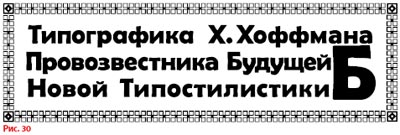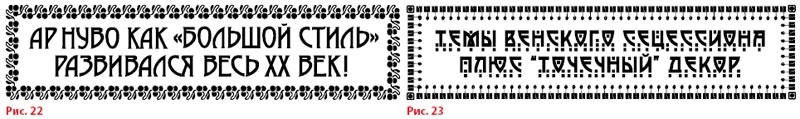 Несколько более жестким выглядит акцидентный шрифт, представленный на рис. 23. Использованные орнаментальные элементы и акцидентную гарнитуру, в принципе, можно не комментировать, тем более что минимально необходимая информация содержится в самом тексте примера. Пожалуй, имеет смысл упомянуть о том, что данный акцидентный шрифт не имеет прямых прототипов в акцидентных разработках художников Сецессиона, а создан, скорее, по мотивам их творчества.