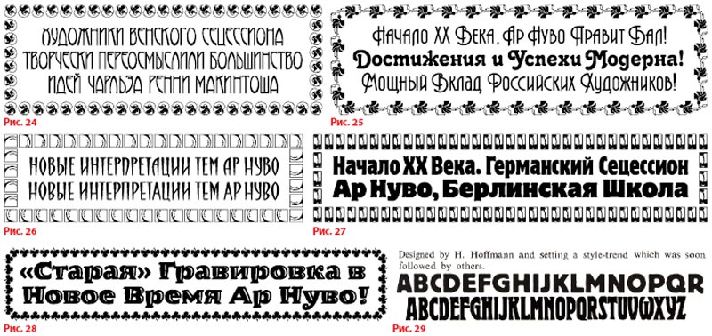 Для того чтобы напомнить, к какому достаточно известному шрифту тяготеет материал рис. 27, приведем комбинированную иллюстрацию (рис. 29), на которой представлены взятые из широко известной шрифтовой энциклопедии «Джаспер, Бэрри и Джонсон» едва ли не лучшие концептуальнозначимые шрифты времен ар нуво: Herold (1901 год) и Block (1908 год).