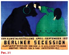 Завершая раздел, приведем пример (рис. 31), который способен доказательно прокомментировать высказанный во вступлении к первой части статьи тезис о преемственности последовавших за ар нуво авангардных стилистик. Приведенный на плакате текст более чем красноречиво демонстрирует сецессионовские основы той лаконичной функционалистской эстетики, эталоном которой позднее стала Высшая школа строительства и художественного конструирования «Баухауз».