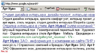 Материал данной статьи содержит достаточное количество современных акцидентных стилизаций, сделанных по темам ар нуво. Именно поэтому автор считает излишним вновь возвращаться к комментированию заголовка статьи. Вместо этого приведем графический образ (рис. 32), лишь сюжетно связанный с вечно живым ар нуво. Легко убедиться, что этот абсолютно современный пример не содержит модернистской графики, однако демонстрирует коммерческую привлекательность ар нуво, которое в данном случае выступает как беспроигрышный «бренд». Приводимая иллюстрация содержит фрагмент окна Интернетбраузера с частью (весьма незначительной) результатов работы популярной поисковой машины, и именно этот пример, в принципе, можно было бы както прокомментировать. Впрочем, вместо такого комментария вполне достаточно констатировать, что ар нуво продолжается. Однако поразному...