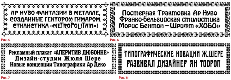 Следующий пример (рис. 5) демонстрирует образец уже чистой ар нувоакциденции. Реальный, изваянный в металле прообраз этой гарнитуры до сих пор можно увидеть в Париже на входе в старое парижское метро (соответствующая иллюстрация была приведена в первой части нашей статьи). Читатели, не знакомые с материалом первой части, могут создать представление об этой графике по шрифту последней строки примера. Для этого были применены альтернативные варианты начертания для букв «T», «P» и «L». Следует отметить, что данная шрифтовая стилизация иллюстрирует сравнительно мало использовавшийся в акциденции XIX века прием жестких угловых сочленений, хотя в данном случае он обусловлен технологией ковки, примененной для изготовления ее прообраза.