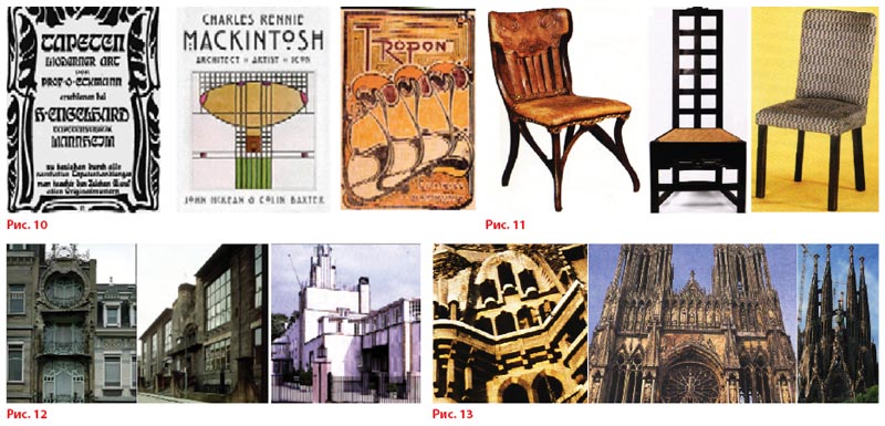 Рассмотрим еще одну комбинированную иллюстрацию, связанную уже не с типографикой, а с мебельным дизайном (рис. 11). Стулья, которые изображены на рисунке, также заметно отличаются друг от друга. Первым вновь поставлен образец, связанный с ранними франкобельгийскими формами ар нуво, который был создан известным парижским дизайнером Эженом Гайаром. Следует подчеркнуть, что автор намеренно выбрал для этого фрагмента стул с достаточно сдержанным модернистским декором, характерным именно для этого мастера. Центральный элемент рисунка попрежнему не нуждается в подробном представлении, поскольку сейчас стулья такого типа широко распространены. Упомянем лишь о том, что, повидимому, впервые подобный подход к конструированию мебели Ч. Р. Макинтош реализовал, решая задачу комплексной разработки интерьеров для своего знаменитого проекта Художественной школы в Глазго (1897—1999). Последний правый фрагмент рисунка содержит изображение стула, дизайн которого принадлежит Йозефу Хоффману — знаменитому дизайнеру, творчество которого из ар нуво постепенно перешло в более поздние формы модерна.
