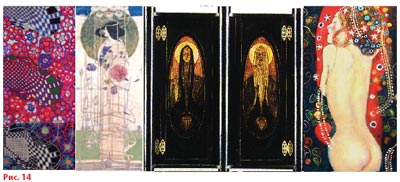 Для полноты картины рассмотрим еще один пример. Авторство первых трех представленных на рис. 14 произведений принадлежит Ч. Р. Макинтошу, и они наглядно демонстрируют связь этого мастера со стилевыми традициями ар нуво, причем в них трудно найти примеры особого аскетизма. Второй фрагмент иллюстрации, на котором представлена одна из интерьерных оформительских работ Макинтоша, вообще весьма близок к эстетике раннего модерна, а центральный фрагмент рисунка может быть признан образцом декларируемого всеми аналитикам родства эстетики модерна с восточным искусством. Первый фрагмент иллюстрации содержит несколько более поздний по времени исполнения рисунок для тканевой набойки. Последний же, правый фрагмент принадлежит кисти Густава Климта, основателя и президента (до 1905 года) венского Сецессиона. Орнаментализированный змеящийся фон этой картины (она называется «Морские гады») во многом отражает стилистику позднего ар нуво.