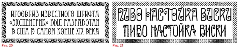 Шрифт, примененный на рис. 22, демонстрирует одну из дизайнерских техник, вошедших в практику в результате развития графических новаций, которые проистекли из ар нуво. Систематически используемые наклонные штриховые компоненты прямостоящих букв, например «А», «В», «Л», «И», придают тексту своеобразную динамику. Впоследствии данные методики широко эксплуатировались также и в Art Deco. Показательно, что изначально, еще десять лет назад, данный шрифт создавался автором в первую очередь для офисного применения. Однако так случилось, что одна из его ранних версий стала фактически условно бесплатной. Будучи свободно распространяемой и в сети Интернет, и на контрафактных носителях, эта гарнитура до сих пор широко применяется как в титульной, так и в рекламной акциденции, невольно демонстрируя тем самым притягательность и значимость тех графических находок ар нуво, которые были сделаны еще в начале прошлого века.