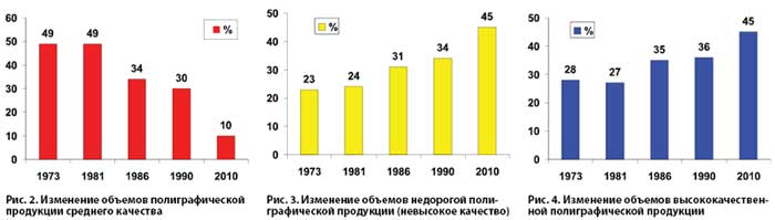 В соответствии с этим прогнозом объем продукции среднего качества, который в 1973 году составлял 49% всего производства, к 2010 году уменьшится почти в пять раз до 10% (рис. 2). Объем недорогой массовой продукции на дешевой бумаге, к качеству которой не предъявляются серьезные требования, вырастет почти в два раза с 23% в 1973 году до 45% в 2010м (рис. 3).