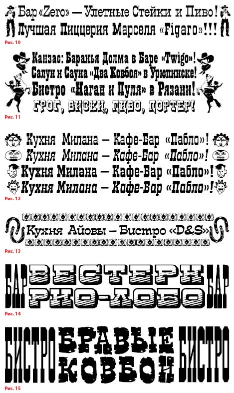 Число примеров, аналогичных представленному на рис. 8, велико. При последовательном рассмотрении примеров такого рода в идеале необходимо вначале приводить цитаты наборных материалов (либо исторических текстовых фрагментов) XIX века, а затем отыскивать для них примеры латинских стилизаций с тем, чтобы в итоге давать примеры кириллических интерпретаций этой графики. Естественно, что на подобное академическое исследование может претендовать далеко не каждая многостраничная монография. Именно поэтому, минуя этап подробного рассмотрения исторического материала двухсотлетней давности, целесообразно сосредоточиться на примерах современной графической интерпретации типографического наследия в стилистике «вестерн», которые предпочтительнее выделить в специальный раздел.