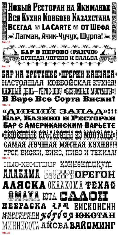 Для России подобное разнообразие, к сожалению, не характерно, несмотря на абсолютно очевидные акцидентные возможности данного типографического материала. Случаи кириллических стилизаций рассматриваемого типа единичны. По субъективному мнению автора, самой оригинальной стилизацией такого рода является шрифт Xenia Western фирмы Paratype. Эта гарнитура довольно широко применялась еще лет десять назад, однако сегодня она, к сожалению, почти не встречается. Первопричина этого кроется в фактическом отсутствии ассортиментного выбора. Именно поэтому для дальнейшего рассмотрения будет использован менее привычный для пользователей шрифтовой материал.