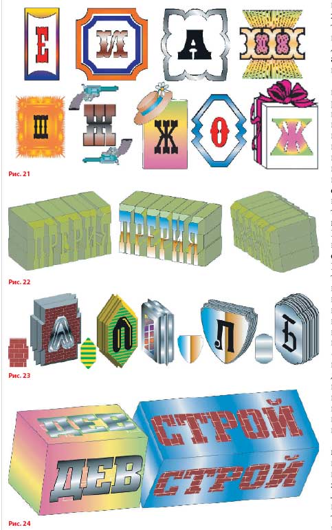 В принципе, еще проще проделывать подобного рода трансформации с отдельными буквами, для того чтобы продуцировать буквицы (рис. 23). В полученных таким образом инициальных элементах могут быть применены не только градиентные заливки, но и различные текстуры.