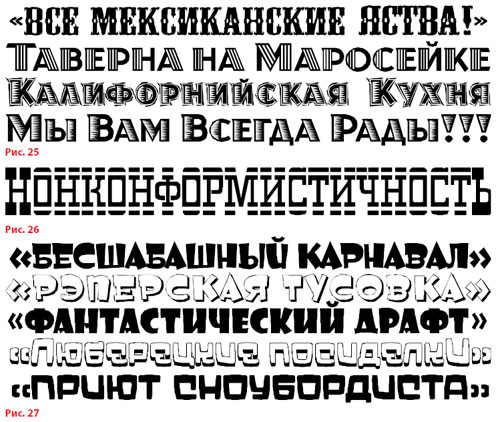 Все представленные на рис. 25 шрифты принадлежат к одной и той же гарнитуре, своим геометризированным дизайном близкой к традициям 30х годов, а в плане гравировки восходящей к до сих пор популярному в США «мексиканскому» декору. Разумеется, у этой гарнитуры нет прямых ксилотипических шрифтовых прообразов, хотя примененные техники декора вполне могут быть соотнесены с гравюрами по дереву в стилистике «афролатина».