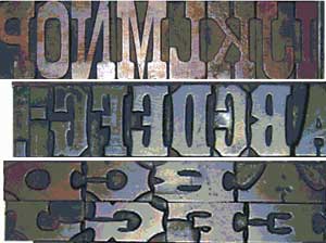 Следуя приведенным ранее образцам «деревянного набора», продемонстрируем еще несколько шрифтов. На рис. 4 представлены стилизации, связанные с графикой на рис. 8 и подобранные таким образом, чтобы в них сочетался сплошной компактный шрифт с декорированной широкой гарнитурой. Даже по небольшому фрагменту компактного текста, графика которого близка по рисунку к шрифту Ponderosa фирмы Adobe, легко убедиться в том, что на этом материале могут легко создаваться крупнокегельные композиции, весьма ценные, например, для наружной рекламы. Две строки в середине рисунка демонстрируют простой, но очень эффектный вариант пазового линейного декорирования, который восходит непосредственно к ксилографическим техникам XIX века.