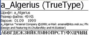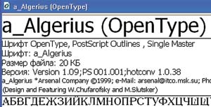 В качестве первого из таких шрифтов возьмем гарнитуру Algerius (рис. 1). Этот шрифт был создан десять лет назад для использования в составе пакета программных продуктов «Русский Офис» и входил в шрифтовой комплект «ТРИОГРАФ». Заказчиком данной разработки выступила компания Arsenal, о чем, в частности, свидетельствует видимый во всех меню префикс «а_» в имени шрифта. По стечению обстоятельств развитие проекта «Русский Офис» вскоре после печально известного дефолта 1998 года было прекращено, а компания Arsenal не стала противодействовать свободному тиражированию графики из комплекта «ТРИОГРАФ». Отметим, что свободно распространяемой является выпущенная в 1996 году версия 01.03 Algerius, в которую не вошли сделанные позже корректировки контуров многих его символов.