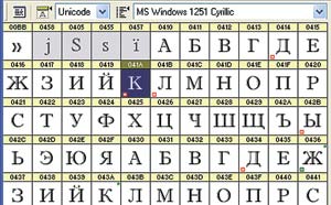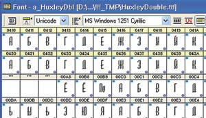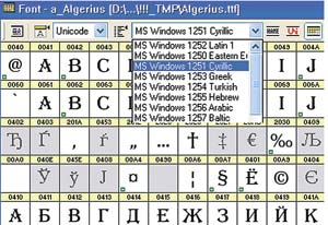 Важно обратить внимание, что строка в верхней части рис. 11 указывает на активацию в импортированном шрифте таблицы MS Windows 1251 Cyrillic. Об этом также свидетельствует желтый цвет верхних секторов в знаковых ячейках, расположенных в двух верхних рядах. При этом все буквы имеют правильные кодовые индексы, полностью соответствующие стандарту Unicode.