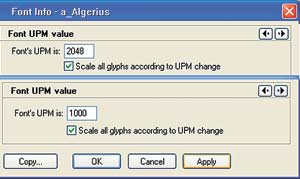 Работа со следующей по порядку функциональной группой — Metrics and Dimensions — предполагает в основном те же действия, что и с PostScriptшрифтом. Единственным отличием будет изменение шрифтовой метрики. Названная метрика задается с помощью параметра UPM, рекомендованные значения которого для TrueType и CFF OpenTypeшрифтов различны и равны 2048 и 1000 соответственно. В верхней части рис. 3 приведен фрагмент рабочего окна, соответствующего исходному значению UPM, ниже помещен фрагмент того же окна, в котором фигурирует уже скорректированное значение.