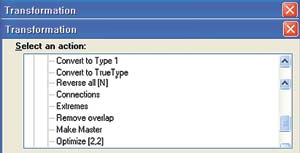 Тем читателям, которые знакомы с редактором Fontographer, напомним, что аналогичные действия там выполняются через позицию Elements главного меню, после выбора которой в выпадающем меню активизируется опция Clean up path. В редакторе FontLab все намеченные действия могут быть выполнены с помощью окна Transform, для активации которого следует выбрать позицию Tools главного меню или использовать клавиатурную комбинацию Ctrl+T.