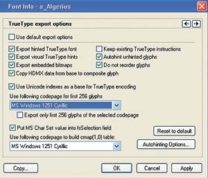 Наиболее ответственной является работа с самой первой из этих панелей — TrueType export options (рис. 8). Следует заметить, что работа с большинством из десяти маркируемых экспортных опций панели требует определенных знаний и знакомства со спецификациями TrueType. Примерно то же самое можно сказать и об использовании двух списочных окон и режимных контрольных кнопок, с той лишь разницей, что при этом необходимо учесть еще и специфические требования платформы, для которой должен быть сгенерирован шрифт. Поэтому, хотя спецификации TrueType можно скачать из Интернета, автор вынужден предупредить, что при отсутствии опыта здесь придется уповать на метод проб и ошибок.
