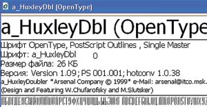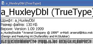 Поскольку в данной статье автор обязан учитывать интересы читателей, не успевших накопить необходимого опыта по работе с шрифтовым материалом, то в завершение раздела приведем еще один пример, в котором будет рассмотрена, казалось бы, не совсем обычная ситуация. Речь идет об особенностях конвертации условнобесплатного шрифта HuxleyDbl (рис. 10), прообраз которого в версии 1.03 тоже некогда входил в набор «ТРИОГРАФ».