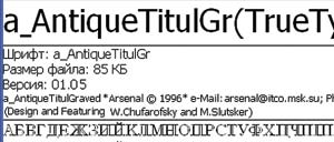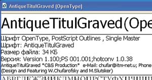 В качестве примера рассмотрим конвертацию PostScriptпереложения свободно распространяемого шрифта AntiqueTitulGr (рис. 13). Этот шрифт был разработан почти десять лет в рамках уже упоминавшегося проекта «Русский Офис» компании Arsenal, но до сих пор остается востребованным (рис. 14). Повидимому, главной причиной этого является тот факт, что стилизация гравировки по антикве в практике отечественных разработок встречается крайне редко.