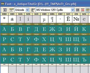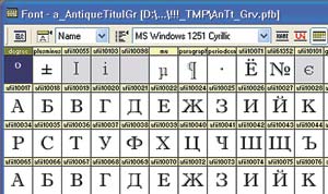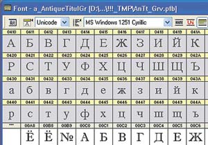 Нажатием кнопки Codepages табличное окно с импортированным шрифтом AntiqueTitulGr переключается в страничный режим с выбором раскладки MS Windows 1251 Cyrillic. Из рис. 16 следует, что в правильном интервале Unicodeномеров, отведенном для букв русского алфавита, все ячейки кодовой таблицы оказались пустыми, в то время как соответствующие знаки в шрифте на самом деле наличествуют, но находятся на неправильных позициях. Поэтому вполне очевидным решением в данном случае будет перенос знаков русского алфавита на отведенные им правильные табличные позиции. Эту операцию проще всего реализовать простым перетаскиванием символов, причем вначале целесообразно переставить одиночные символы, например буквы «Ё» и «ё» и знак нумерации «№», а затем, выделив всю оставшуюся алфавитную последовательность, перенести ее на положенные им по энкодингу СР1251 места. Результат выполнения описанных действий иллюстрирует рис. 17.