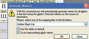 Еще одной пока не рассмотренной практической проблемой является перевод в OpenType тех PostScriptшрифтов, которые иногда называют неправильными. Дело в том, что еще недавно многие дизайнеры работали со шрифтами, кириллические символы которых не имели имен, выделенных для них фирмой Adobe почти 20 лет назад. Как известно, в своих спецификациях Adobe предусмотрела набор именидентификаторов для букв русского алфавита: для прописных — в интервале от afii10017 до afii10049; для строчных — от afii10065 до afii10097.