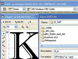 Сберегая журнальное пространство, опишем здесь только действия, которые были выполнены для получения альтернативного варианта начертания буквы «К». Активизировав ячейку с именем afii10076, выберем пункт Export to EPS меню Glyph (см. рис. 19), после чего будет вызвано окно Save EPS file (рис. 22). Задав в данном окне имя «K_lc», сохраним этот файл для автономного редактирования, которое может быть выполнено в практически любой программе векторной графики.