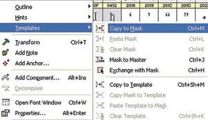Полезной процедурой является дублирование содержащейся в окне редактирования (левая часть рис. 22) графики в новый слой. В программе FontLab эта операция реализуется посредством копирования исходного начертания буквы «К» в контрольную подложку, которую разработчики назвали слоем маски. Сохраняемая в этом слое и видимая в окне редактирования контурная копия позволит уточнить масштаб и положение нового, отредактированного начертания буквы «К». Для копирования контура в слой маски надо выполнить команду Copy to Mask опции Template контекстного меню (рис. 23) или использовать клавиатурную комбинацию Ctrl+M.