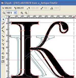 Отредактировав контур, сохраняем его в файле K_lc@ и копируем в окно редактирования ячейки afii10076 (опция Import from EPS меню Glyph). После того как обновленное начертание буквы «К» скопировано в окно afii10028 (рис. 24), новое начертание буквы надо масштабированием подогнать к принятому в шрифте размеру прописных букв Caps Height, а затем, при необходимости, уточнить положение правого апроша. Следует также удостовериться, что у внутренних контуров выбраны правильные направления обхода. Кстати, рис. 24 наглядно подтверждает, насколько полезно иметь во вспомогательном слое дубликат старого начертания.