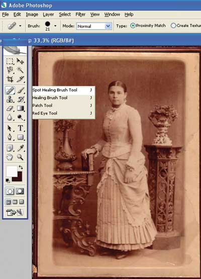 Для реставрации портрета нам понадобятся несколько инструментов и придется прибегнуть к ряду приемов. Техника копирования и вставки будет использоваться для больших поврежденных участков и для реставрации пустых зон, а Clone Tool (штамп клонирования) и Healing Brush (лечащая кисть) — при работе с небольшими участками, пострадавшими не так сильно. Но для получения наилучшего результата прежде всего необходимо отсканировать изображение с высоким разрешением. Тогда, увеличивая изображение для ретуширования, мы сможем четко различать детали.