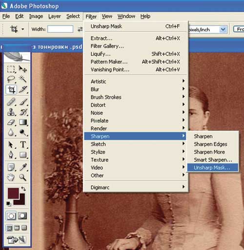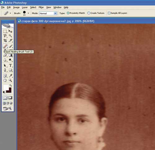 Сначала удалим мелкие дефекты с фотографии — для этого воспользуемся инструментом Spot Healing Brush. Он появился только в версии Adobe Photoshop CS2, поэтому, если у вас более старая версия Adobe Photoshop, воспользуйтесь другим инструментом — Healing Brush, расположенным в том же меню (рис. 2).