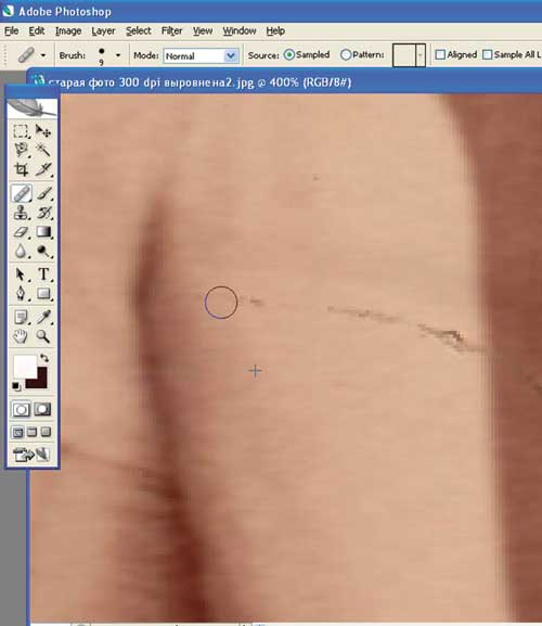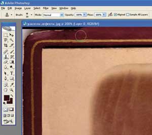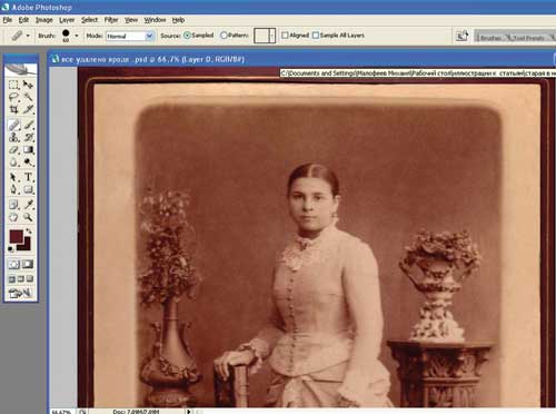 С помощью инструмента клонирования восстановим поврежденные участки по краям фотографии. Для этого нажмем клавишу Alt, укажем ручкой от планшета на хорошо сохранившийся фрагмент и закрасим поврежденные участки. Размер обработки будем контролировать с помощью силы нажатия на ручку от планшета (рис. 8 и 9).