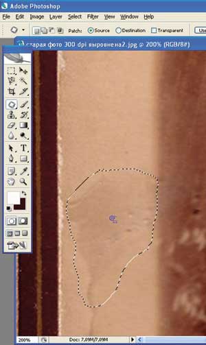 Для восстановления больших однородных участков можно применять инструмент Patch (Заплатка), который находится в том же меню, что и Healing Brush. Выделите поврежденный участок инструментом, потом замкните контур и перетащите выделенный фрагмент на хорошо сохранившийся участок с похожей тональностью (рис. 5).
