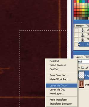 Левый нижний угол нашей фотографии поврежден. Чтобы восстановить его, скопируем правый угол фотографии, который сохранился целиком. Для этого выделим левый нижний угол фотографии с помощью прямоугольного выделения и нажмем на нижнюю кнопку на ручке от планшета или на правую кнопку мыши и выберем меню Layer via Copy (Слой через копирование). Далее инструментом Move перенесем выделенный объект в левый угол, сделаем зеркальное отображение объекта (для этого нажмем Ctrl +T) и потянем за правый маркер посередине рамки, чтобы отвести изображение налево. Затем совместим линии таким образом, чтобы не было заметно вставки (рис. 6 и 7).