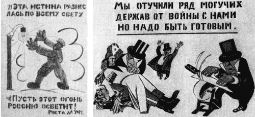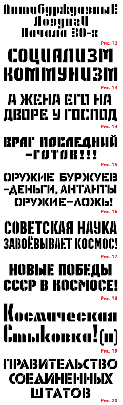Послереволюционный перелом, который был характерен для общественного бытия и общественного сознания в большевистской России, стал своеобразной питательной средой, в которой «левое» искусство не только быстро взросло, но и, приобретя широкий резонанс, даже стало образцом для европейского. На рис. 6 представлены характерные примеры трафаретного текста с плакатов знаменитой серии «Окна РОСТА», созданных поэтом и художником В.Маяковским и художником М.Черемных.