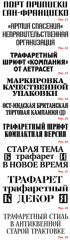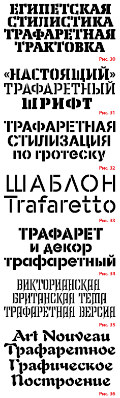 Трафаретные гарнитуры были введены в акцидентный набор сравнительно поздно — только в 30е годы прошлого века. О популярности данных типографических тем и сегодня свидетельствуют не только каталоги ведущих вендоров, но и freewareресурсы Интернета, причем число разработок трафаретных шрифтов год от года увеличивается. К сожалению, российские дизайнеры не избалованы большим разнообразием шрифтового материала рассматриваемой стилистики. Вместе с тем отечественная акцидентная практика свидетельствует о наличии интереса пользователей к данному виду шрифтов. В частности, показателен тот факт, что различные кириллические версии шрифтов Stancil BT и Stancil URW применяются вот уже почти десять лет.