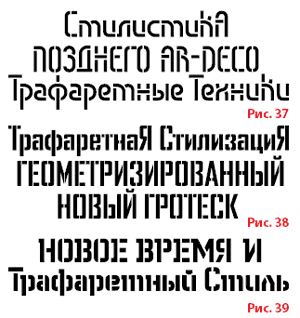 Завершая раздел, еще раз напомним, что в каталогах практически всех шрифтовых вендоров сейчас наличествуют трафаретные шрифтовые стилизации, в которых обыгрываются темы 30х годов прошлого века. Причем в последние годы появилось немало новых разработок, в которых поновому трактуются графические идеи того времени.