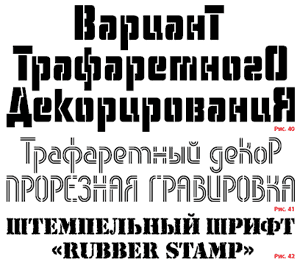Рассмотрим еще три примера трафаретных стилизаций по темам, близким к современной жесткой и лаконичной стилистике. На рис. 38 приведена оригинальная авторская разработка, которая фактически представляет собой технизированный компактный гротеск с трафаретной отделкой. На рис. 39 также представлен оригинальный авторский материал, в котором была сделана попытка поместить на знаках шрифта ритмизирующие его рисунок полусерифные конструктивные элементы. На рис. 40 демонстрируется кириллическая стилизация с довольно сложным трафаретным декорированием, прообразом которой стала одна из условнобесплатных разработок американской дизайнерской группы Soft Horizon.