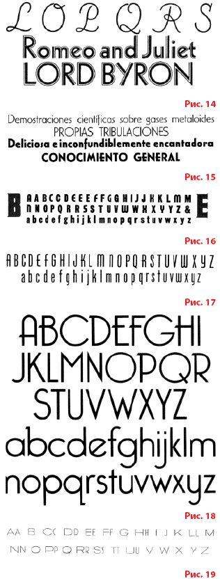 Приведем несколько примеров, для которых подобраны шрифты рассматриваемого типа. Для того чтобы найти нужный графический материал, здесь пришлось обратиться в первую очередь к имеющимся в Интернете шрифтовым ресурсам из SOLOTYPE TYPOGRAPHERS CATALOG. Эту коллекцию известный за рубежом знаток шрифтового искусства и энтузиаст Дан Соло собирал в течение многих лет, подбирая для нее материалы из самых разных источников, вплоть до уличных вывесок.