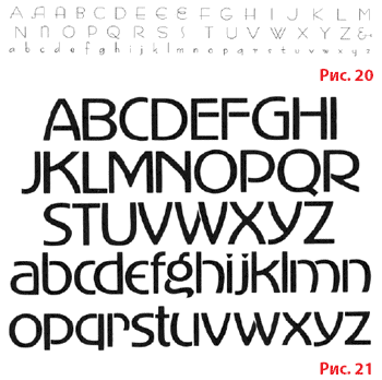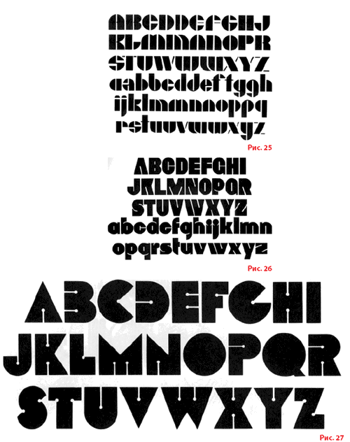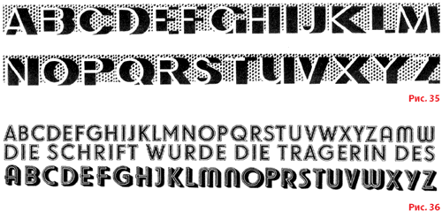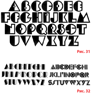Рассматривая последние примеры, нужно обратить внимание читателей на то, что если полностью отвлечься от мысли о необходимости в шрифте трафаретных рассечений контуров, то графику, например, двух ранее приведенных иллюстраций (см. рис. 28 и 29) можно рассматривать просто как результат применения двух конкретных декоративных методик. Более подробному обсуждению подобных методик посвящен следующий раздел.