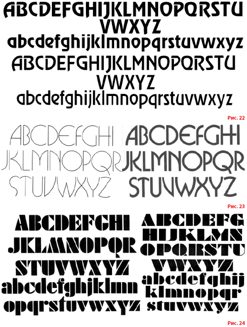 В силу специфического характера графики той подгруппы шрифтов, рассмотрение которых завершает этот раздел, вместо того чтобы описывать их графические особенности, отыскивать аналоги и пытаться проводить классификационные параллели, приведем комбинированный пример (рис. 24) установочного характера. В данную иллюстрацию вошли разработанные почти одновременно шрифты: FUTURA BLACK (П.Реннер, 1929) и BRAGGADOCIO (В.Вулли, 1930).