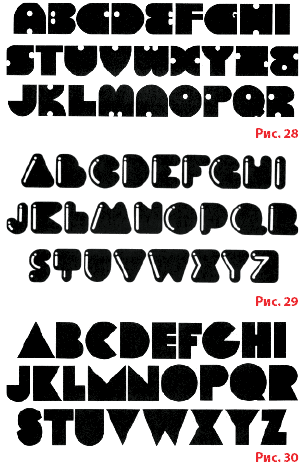 Если примененный подход трактовать более свободно, то можно прийти к тому, чтобы исключить сами стэнсильные рассечения контуров. Это демонстрируют следующие два примера, в которых показаны алфавитные ряды шрифтов JOYCE BLACK и MINDY HIGHLIGHT (рис. 28 и 29).