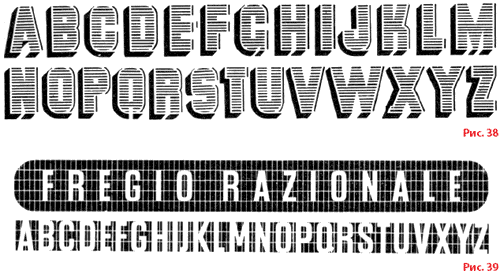 В первом из этих примеров (рис. 37) в увеличенном масштабе (он здесь выбран для того, чтобы декоративные прорези могли быть воспроизведены в оттиске) представлен алфавитный фрагмент гарнитуры KOMBINETTE (1932). В следующем примере (рис. 38) аналогичный вариант декорирования применен уже в пластической шрифтовой разработке FLORIDE (1938), а в последней из этих иллюстраций (рис. 39), где процитирован шрифт RAZIONALE (1935), декоративные взаимно перпендикулярные прорези наложены уже только на камейные подложки.