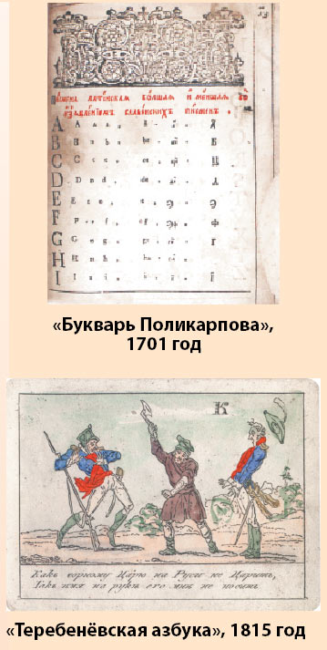 Через сто лет, при Александре I, появилась азбука Ивана Теребенёва. В ней уже были иллюстрации в цвете — карикатуры на побежденную французскую армию во главе с Наполеоном. Так в начале XIX века дети постигали азы патриотизма.