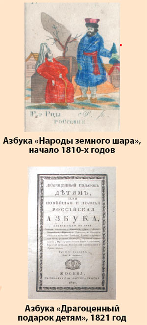 В цветной азбуке «Народы земного шара» (начало 1810-х годов) подрастающее поколение знакомилось с представителями разных народов, живущих не только в России, но и в других странах.