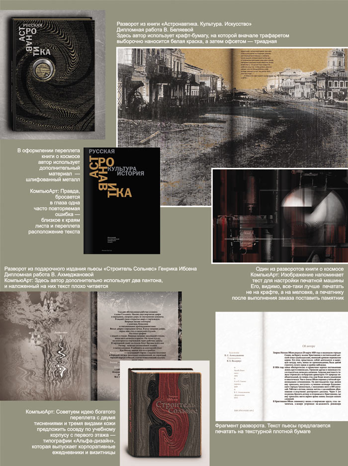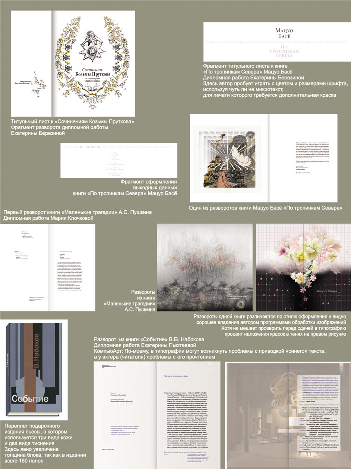 На примере дипломных работ видно, что наши выпускники подготовлены для работы в издательствах. Они знают программы верстки и создания изображений, полиграфические технологии и имеющиеся на рынке расходные материалы, которые можно использовать в дизайне, не останавливаясь только на одном переплете 7БЦ. Здесь важно подчеркнуть, что, в отличие от выпускников других художественных вузов, наши сочетают в своей работе умение рисовать руками с хорошим владением издательскими программами, тем более что практические занятия проводятся в оснащенном современным оборудованием классе.