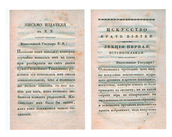 Для тех, кто хотел разобраться в разновидностях взяток, а также изучить возможности и способы их получения, в 1830 году в типографии Н. Греча вышла книга под интригующим заглавием: «Искусство брать взятки. Рукопись, найденная в бумагах Тяжалкина, умершего титулярного советника». Хотя почивший автор имел лишь скромный гражданский чин IX класса (соответствовавший армейскому штабскапитану), его опыту, как утверждало предисловие, могли позавидовать и более титулованные особы, а причины, заставившие Тяжалкина взяться за перо, должны были вызвать глубочайшее неравнодушие читателей.