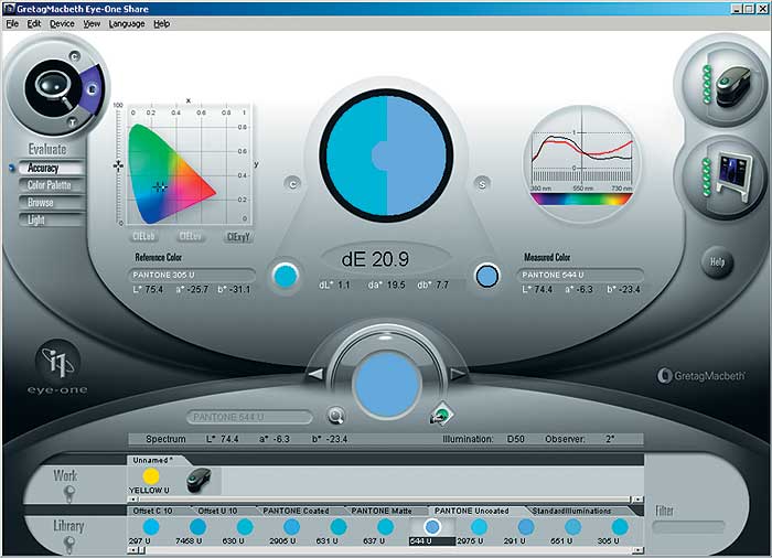 Режиме Create, как следует из названия, предназначен для создания цветовых библиотек. Режим Evaluate предоставляет пользователю расширенные возможности по анализу цвета и сравнению его с цветом, хранящимся в цветовой библиотеке. В данном режиме возможно вычисление цветовой разности Deltа E, а также разности цветовых координат L, a и b цветового пространства Lab. Кроме того, анализируемый цвет можно отобразить в цветовом пространстве Lab, Luv или xyY. Если измеренный цвет не может быть воспроизведен тем или иным цветовым пространством (попросту говоря, не входит в цветовой охват устрой-ства), то он специальным образом индицируется. Кроме того, возможно просмотреть спектральную кривую измеренного цвета и проанализировать разницу между измеренным образцом и эталонным образцом из цветовой библиотеки.